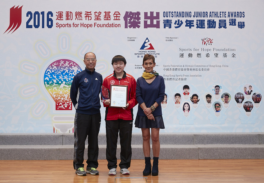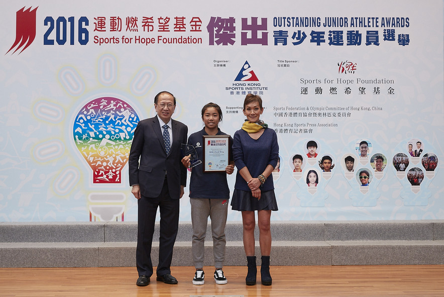 Windsurfer Mak Cheuk-wing drew the world’s attention at the Techno 293 World Championships 2016 by winning the girls U15 title.  She was selected as the Most Outstanding Junior Athlete of 2016 which is presented to an awardee who has achieved the best result.  Another promising player, Mak Tze-wing of table tennis, was presented the annual award of the Most Promising Junior Athlete as she was the most prolific award winners in 2016 with at least three quarterly awards.  The Hong Kong Table Tennis Association was presented the Most Supportive National Sports Association for their submission of the highest number of successful nominations for 2016.